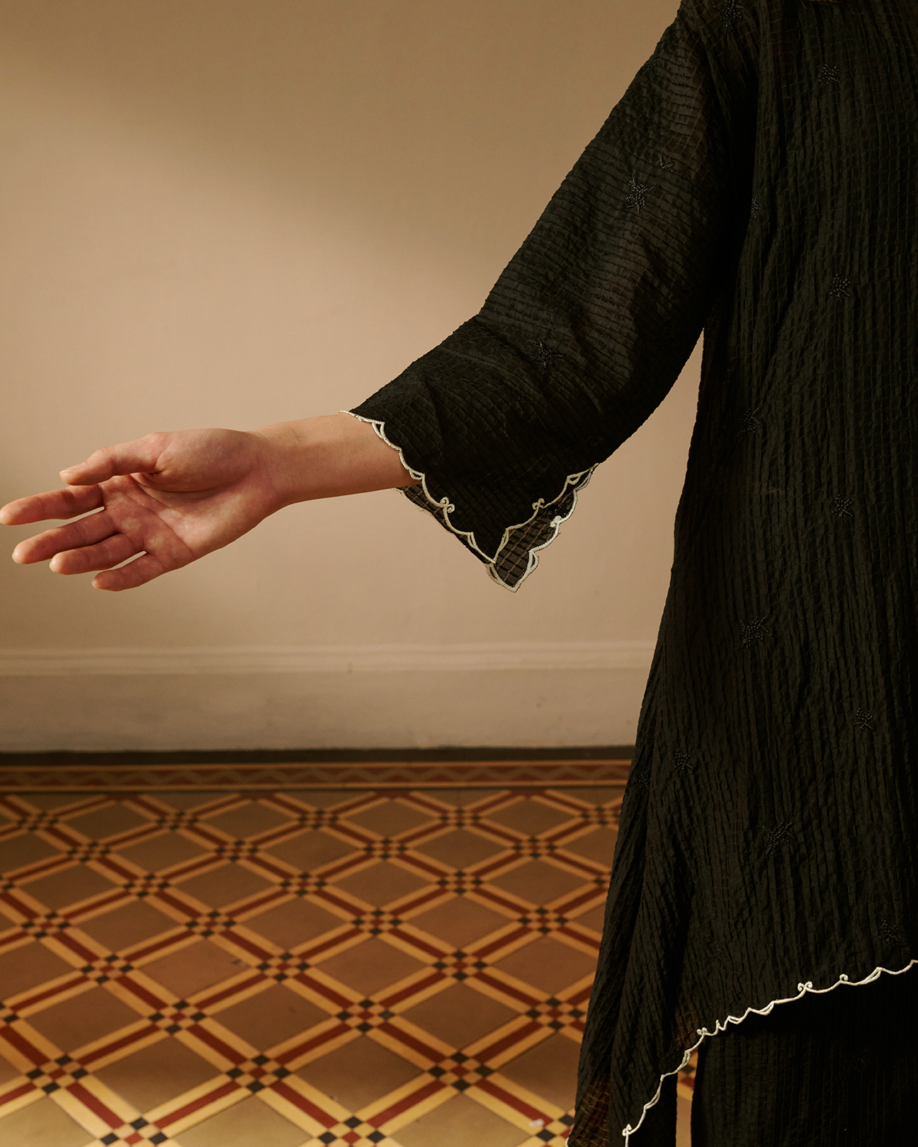 Bold in simplicity, refined in detail. The Rerama Kurung Set is crafted from rich black textured fabric with a natural volume and a slightly sheer finish creating flowing silhouette. Scalloped trims frame the neckline, sleeves, and hem, while the asymmetrical layered cut adds soft movement.
