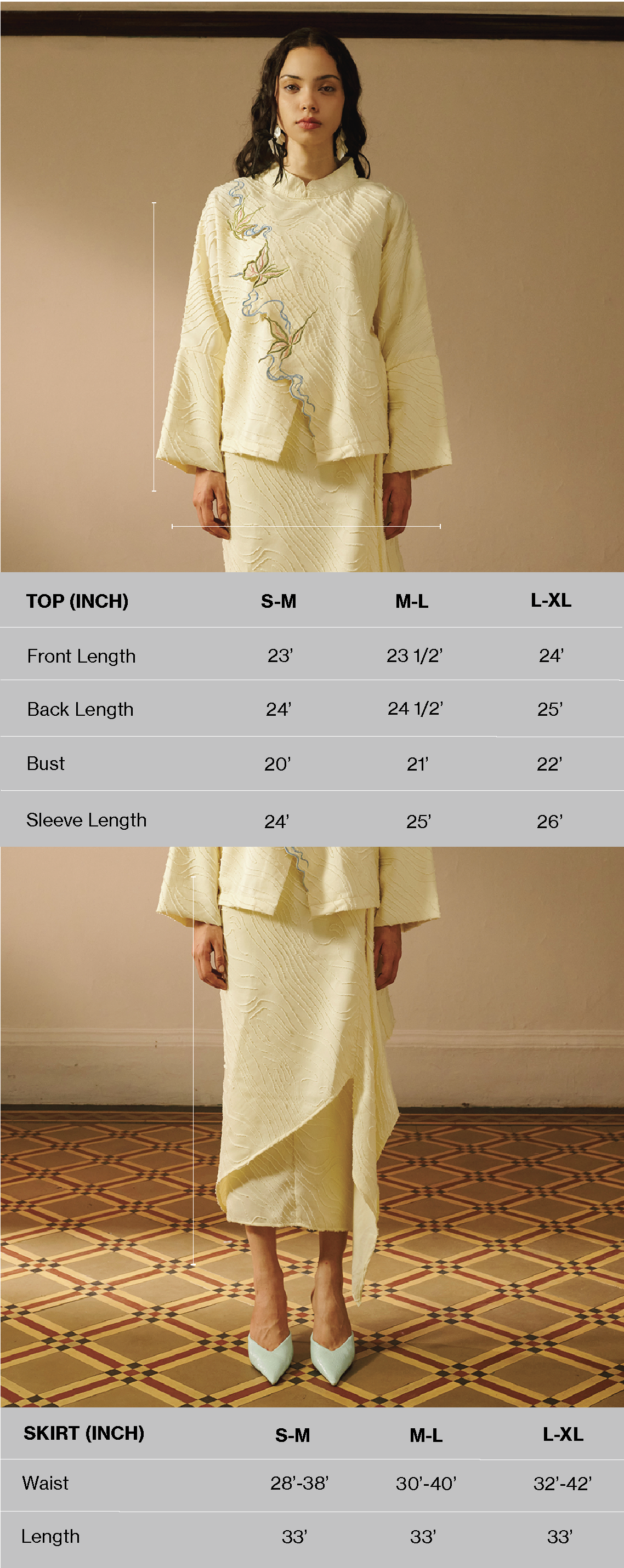 The Sayara Set is crafted from rich textured fabric with subtle wave finishes that add depth and character to the surface. Rendered in a luminous cream hue, the relaxed silhouette drapes gently over the body while maintaining a clean, structured presence. The high neckline and wide straight sleeves lend a modern touch while preserving effortless modesty.