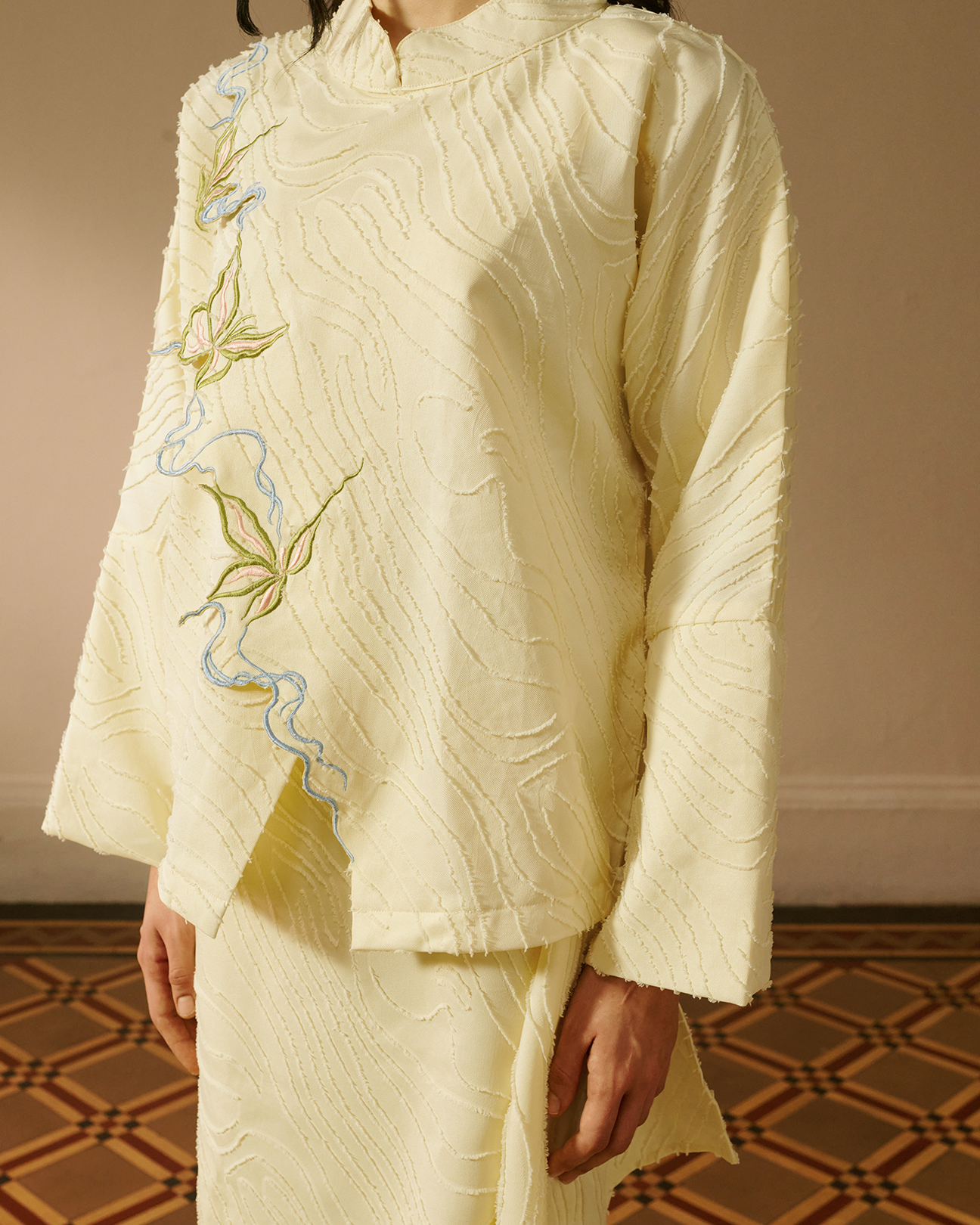 A soft asymmetrical front panel creates refined dimension, highlighted by delicate embroidery that trails organically across the front in subtle blue and green tones. The light base enhances the intricacy of each stitch, allowing the motif to stand out with quiet elegance.